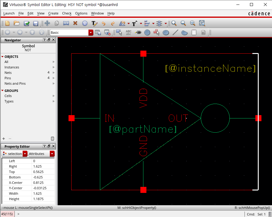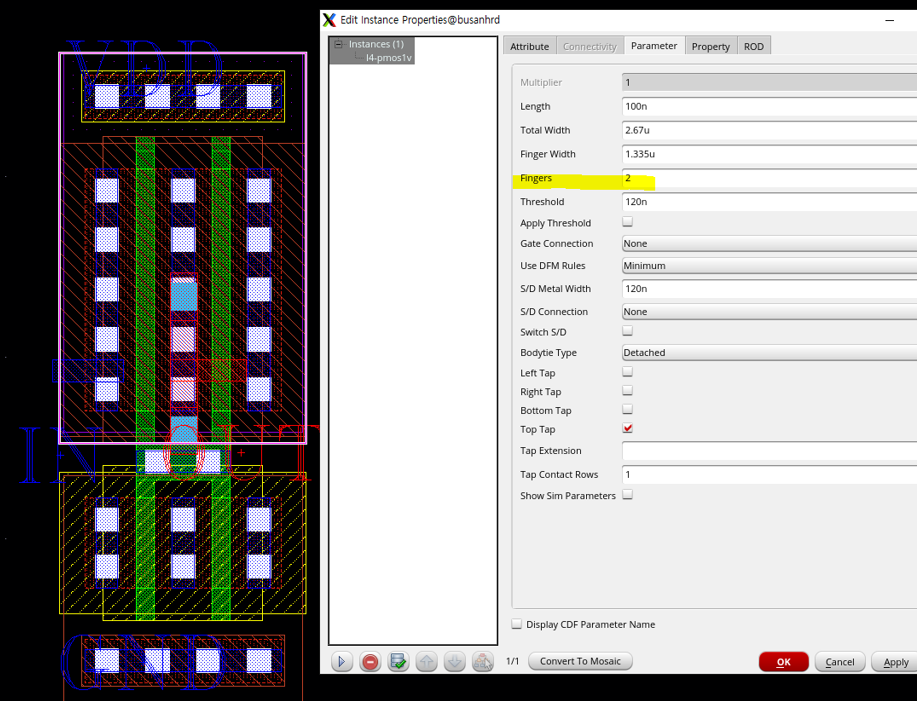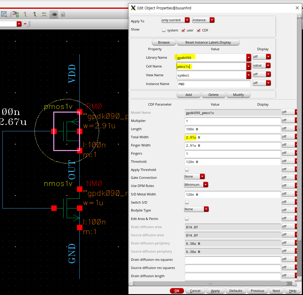 gpdk090 라이브러리의 pmos1v, nmos1v 사용