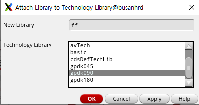 'Attach to an existing technology library' > gpdk090으로 설정 해주었어야 함