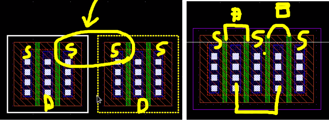 같은 pmos, source 단자끼리 sharing 가능 > 공간 줄임 >> gate 4로 만들 수도 있음!