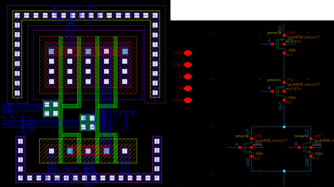 NTAP(BULK)+ SOURCE(NTAP연결) + DRAIN(메탈2, 비아 뚫어 연결) + 게이트 (A,B 입력신호)