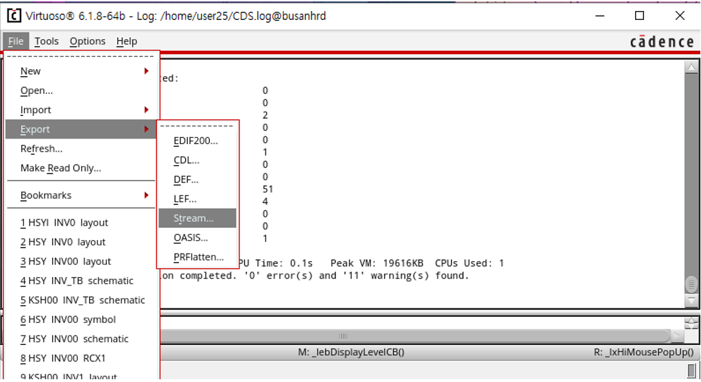 log 창에서 FILE > EXPORT>STREAM 으로 gds 파일 export 가능.