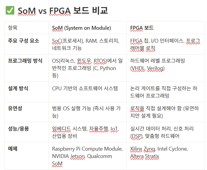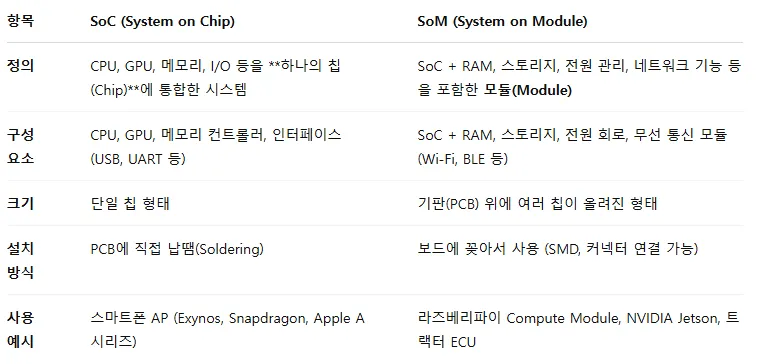 SoC만으로는 완전한 시스템을 만들기 어려운데, SoM은 꽂기만 하면 바로 작동할 수 있도록 만들어진 모듈